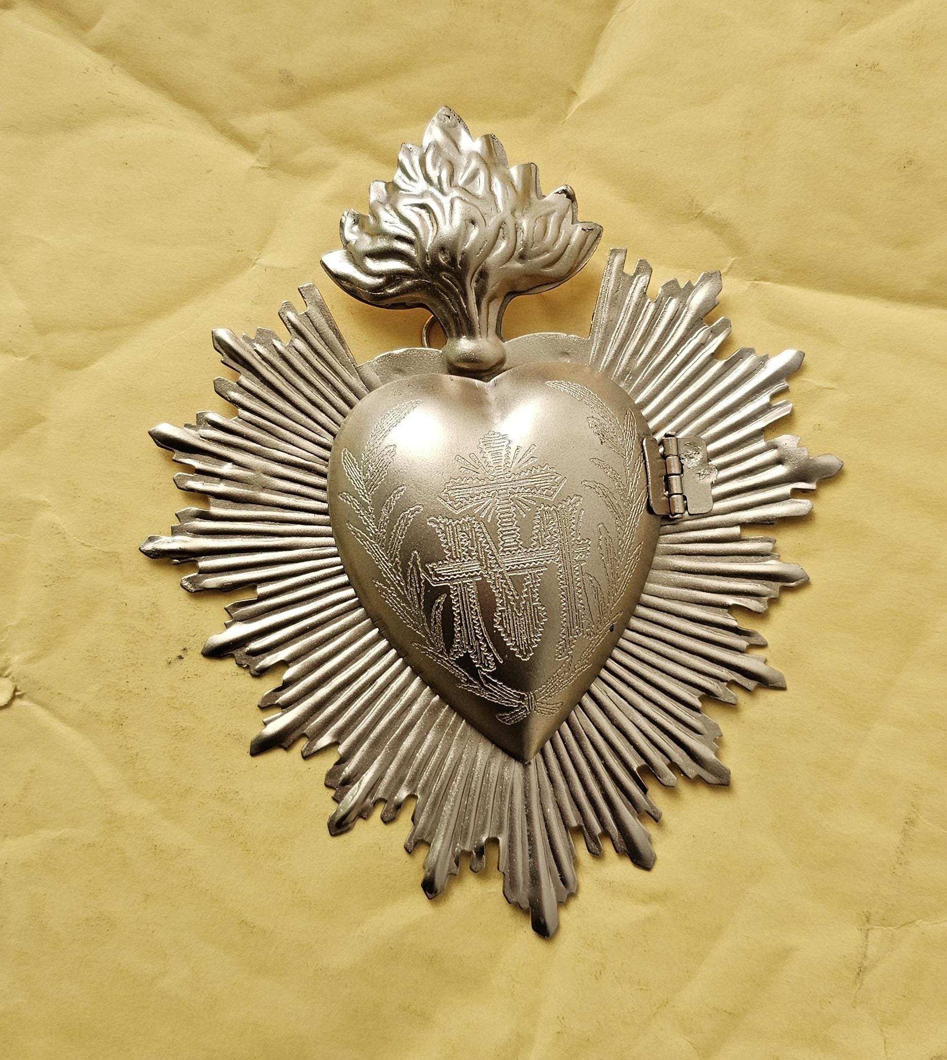 Product Description: Iron Hanging Heart Gold finish, Locket Style Milagros, cache' Flaming Heart 5”x4”x1” inches